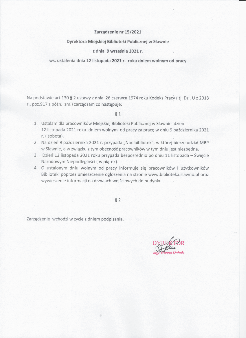 Zarządzenia Dyrektora Miejskiej Biblioteki Publicznej w Sławnie 2021 rok