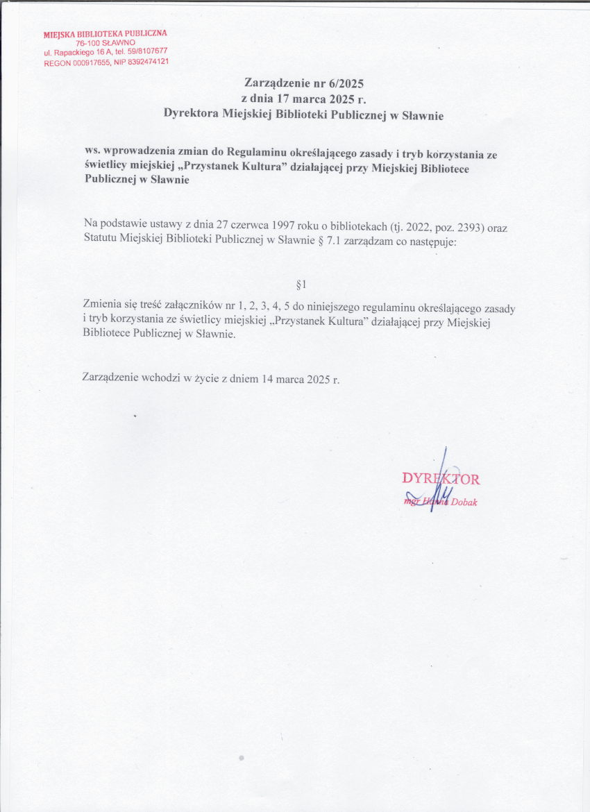 Zarządzenia Dyrektora Miejskiej Biblioteki Publicznej w Sławnie 2025 rok